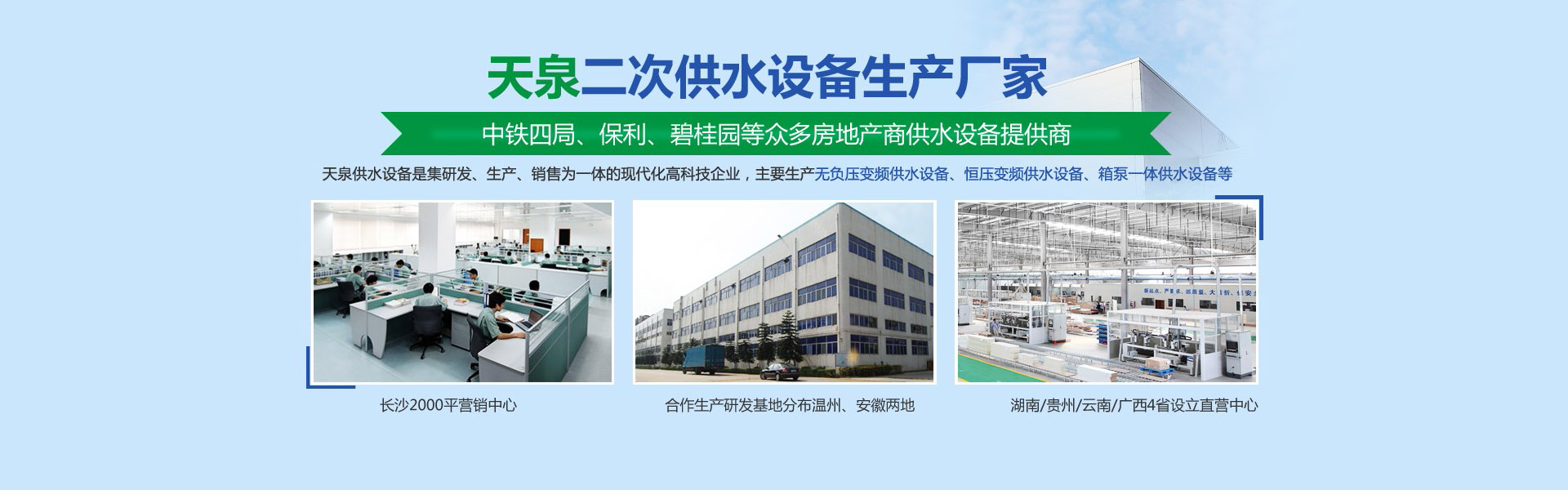 長(zhǎng)沙天泉供水設(shè)備有限公司位于長(zhǎng)沙雨花經(jīng)濟(jì)開(kāi)發(fā)區(qū)。公司是集研發(fā)、生產(chǎn)、銷(xiāo)售為一體的現(xiàn)代化科技型企業(yè)公司生產(chǎn)銷(xiāo)售的產(chǎn)品有無(wú)負(fù)壓變頻供水設(shè)備、自來(lái)水加壓泵站、變頻調(diào)速恒壓供水設(shè)備、智慧標(biāo)準(zhǔn)泵房、智慧水務(wù)、一體化預(yù)制泵站、循環(huán)水系統(tǒng)工程等二十幾大類(lèi)別。